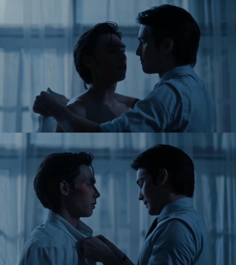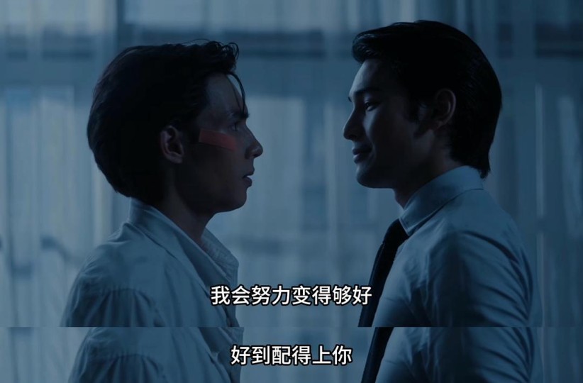 明镜高悬,独不照我。Trin对所有人都好好。看EP6的时候,Apo戏外拍的那些像小菩萨一样的照片总是在我脑海浮现,戏内戏外又产生了重叠。Trin就像一个心软的神,对所有人都充满同情心,明明自己也是肉体凡胎,还要去救那些不领情的傻乎乎的大学生。 泥菩萨过河,其实我们不应该带着调侃的语气。泥菩萨难道自己不知道自己是泥塑的吗?可是它还是带着不知道是谁发放的任务——可能是出于过高的道德标准自己给自己发放的吧——去过河拯救世人。 他对婶婶也好温柔,天天住在一个屋檐下,聪明敏感如他,难道看不出婶婶的不被爱吗。所以他忍着一大早胃里的翻腾强行咽下去了两个小油条,还有结束惊险一天回家之后,他轻轻的握住婶婶的手臂,最后温柔的把她揽进怀里。明明都是俊男靓女,但是看着一丝暧昧的气息都没有,看得人心软软。 他甚至对待政敌都充满同理心,项目被搅黄了,他却说如果过程是不透明的,被叫停也是理所应当。我一直觉得说出这句话的那一刻才是维克多完完全全爱上他的那一刻,之前在EP4、EP5小狼狗其实更多的是追逐、荷尔蒙以及和老狼狗(对不住了mile哥)的竞争,有点享受追逐爱情游戏的感觉。但是什么真正的打动一个有理想的青年?那必须是共同的信仰,是灵魂的共鸣。前面他们或多或少有分歧,这一刻他意识到他们是一样的人,兜兜转转,发现自己没爱错人,这太让人心动了。 反过来看老狼狗Thanwa,他……太不一样了。这一集给了我更大的割裂感,Trin和学生们在硝烟弥漫的街头险象环生,镜头一转,老狼狗和嬉皮士们在后院自己打造的虚假的乌托邦里吞云吐雾。如果他积极参与,他应当拥有很大的能量(爸爸是资本本身,自己是influencer),但是他不选边站,其实就是逃避。小狼狗当然不甘心,他拿什么跟我比?
