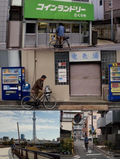 男主日复一日干厕所清洁工的工作(电影中有很多男主认真工作的片段,让我不禁感叹日本的厕所设计的好有创意)每天早晨听着晨起扫地的声音起床,一贯的洗漱浇花,出门前在自动贩卖机前买一瓶咖啡,在工作的路途中放着自己喜欢的磁带,每一次的工作都极度认真(不会觉得是干清洁工让人不屑一顾,反而能从工作中找到活着的乐趣),午饭时会买袋三明治,坐在长椅上望着空中树枝飘动的声影,下班后会去澡堂洗澡,在自己常去的餐厅吃一顿晚饭,睡前还会看看书,到了休息日也是一贯的去洗衣房洗衣,再骑着自己的自行车去到胶卷店洗照片...