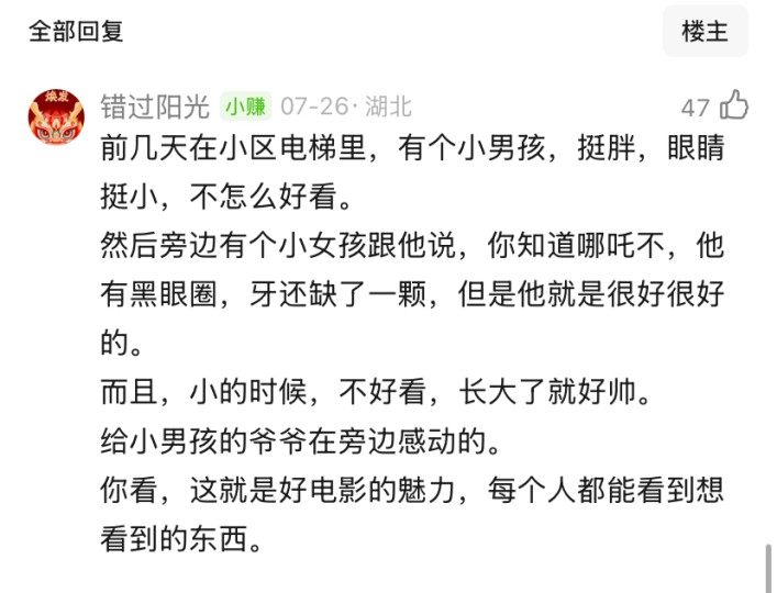 结尾再给大家分享一下我此前在豆瓣写“哪吒”文章下,一条温暖的评论。下图: