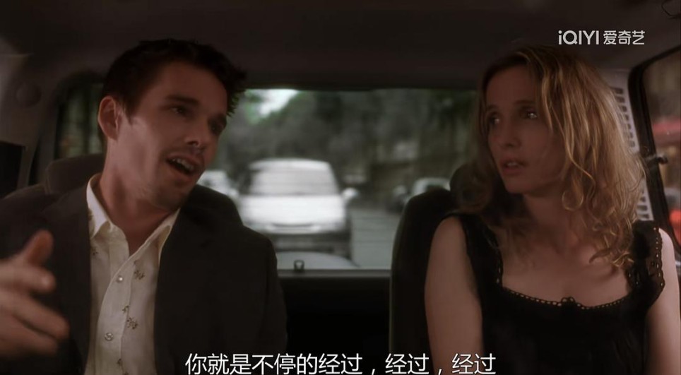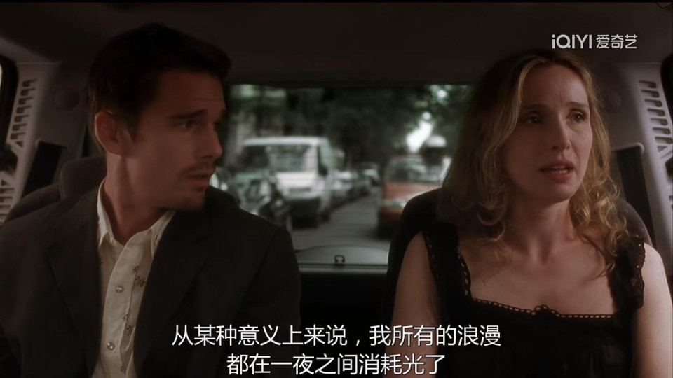 爱情。 80分钟的电影,篇幅很短,故事发生的时间也只不过是日落之前的几个小时。 从书店到房间,两人对话的主题越来越深刻,最后似乎是在恋恋不舍中和解。 从书店漫步到咖啡厅的路上,久别重逢,诉说着九年前的相遇,对彼此的怀念,生怕被对方忘记,尽管有未能赴约的遗憾,但再会的兴奋之情仍溢于言表; 在咖啡厅时,他们才知道,原来两人曾在98年至99年这两年间,都居住在纽约这个城市,只是不曾遇见过对方; 本来喝杯咖啡就要走了,但想说的话还远远没有说完,于是两人又边走边聊,回忆着过去,也讲述着其他; 行至塞纳河畔,在邮船停靠处,兴致高涨,便上船观光。原来,他去往婚礼的路途中,透过车窗看到的熟悉的身影,居然真的是她。只不过,又一次在人海茫茫中错过。 下船后,在车上的对话是全片的高潮部分。两人都有各自的不如意,她的感情生活总是不顺利,她把所有的浪漫都给予在九年前的那个夜晚;而他看似过着体面的生活,实则是稀里糊涂的结了婚,在一个没有欢笑的家庭中硬撑。他的梦那样的深情那样的悲痛,如今她就在眼前,可是早已物是人非。如果九年前的那一次,她赴约出现了呢?那么两个人的人生轨迹会大不相同吗?会幸福的走到最后还是会厌倦对方而不再见?到后面,她控制不住自己的情绪,她因为看了他写的书,又回忆起了这一切,又渴望着见到他,可是见到了却徒增伤感。 送她到家门口后,他还是不舍,或许他早就下定了决心——从见到她的那一瞬起。航班怎么可能比得上和多年未见的挚友聊天重要?踏上有年代感的楼梯,来到了她的房间。或许在车上就已经把最真实的感触讲出来了吧,现在他只想听她唱两首歌。而影片最后也在悠扬的cd声中结束,伴着她的模仿舞步,还有他的感伤的笑。他要错过航班了,或许他最开始就是这么打算的。 影片很感人,距离我看的第一部已经过去很长时间了。但远没有他们分别的时间那么长——九年。两部影片的拍摄间隔时间也是九年,九年光阴逝去,两位主演的脸颊上早已褪去了稚嫩与青涩,多了几道皱纹,脸部肌肉也开始松弛……关于爱情,我没有什么发言权,我只有憧憬与希冀,祈祷自己是个幸运儿。 两个人在一起有聊不完的话题,总是把分别的时间往后延长,这是我最为动容的一点。